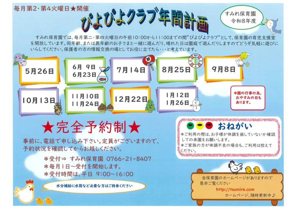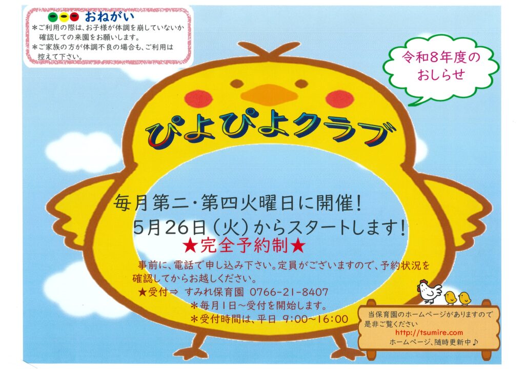 未就園の集い(ぴよぴよクラブ) 一時保育(育児支援室) 未就園の集い(ぴよぴよクラブ) ぴよぴよクラブへようこそ! 一時保育(育児支援室) 育児支援室へようこそ! 感染症予防のため、お子様・ご家族の方のご利用1週間前からの体調管理にご留意ください。